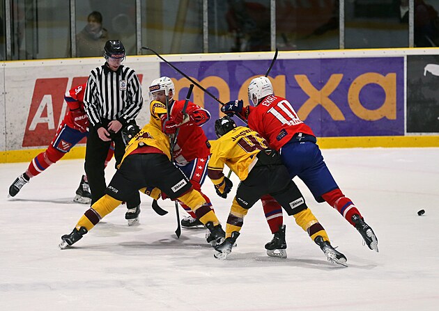 Momentka z utkání mezi Duklou Jihlava a Horáckou Slavií Třebíč ve čtvrtfinále play-off první hokejové ligy.