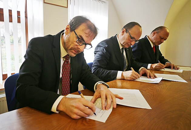 Koaliční dohodu v Jihlavě podepsali lídři ANO Radek Popelka (vlevo), Petr Ryška (ODS, uprostřed) a Martin Laštovička (KDU-ČSL, vpravo).