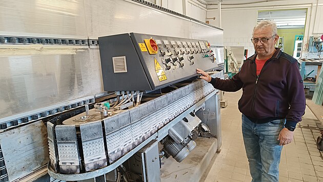 Jedním z největších strojů, které ve Sklenářství Slanina dosud jsou, je tato linka na broušení skleněných tabulí. Podle Milana Slaniny patří k základnímu vybavení každé větší sklenářské dílny.