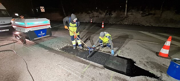 Opravy výtluků i za nižších teplot umožňuje silničářům nová mikrovlnná technologie. Práce probíhají na dvě směny i v nočních hodinách.