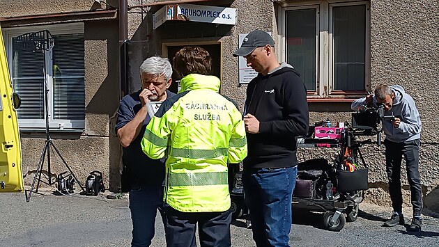 Herec Michal Suchánek s režisérem Janem Haluzou a představitelkou záchranářky ladí poslední detaily před natáčením záběrů v sanitním voze.