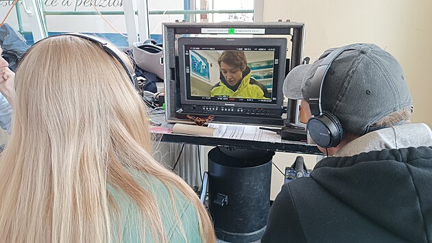 Režisér Jan Haluza (vpravo) se svým týmem sledoval záběry v zadním vestibulu polikliniky. Veškerá domluva probíhala prostřednictvím vysílaček.
