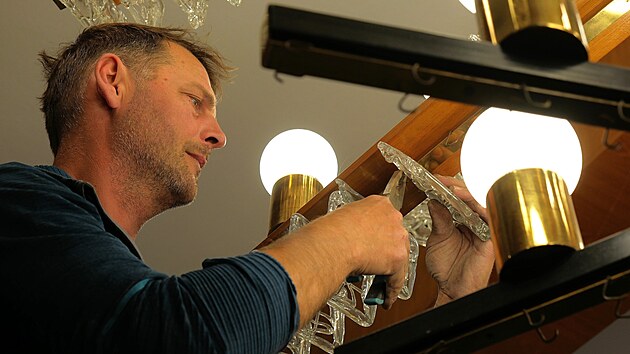 Rozebrání lustrů znamenalo pečlivou a opatrnou práci se stovkami skleněných destiček, upevněných k ramenům svítidla drátky.