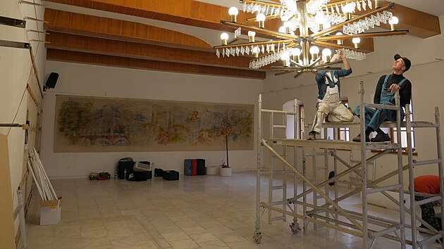Rozebrání lustrů znamenalo pečlivou a opatrnou práci se stovkami skleněných destiček, upevněných k ramenům svítidla drátky.