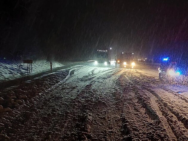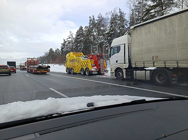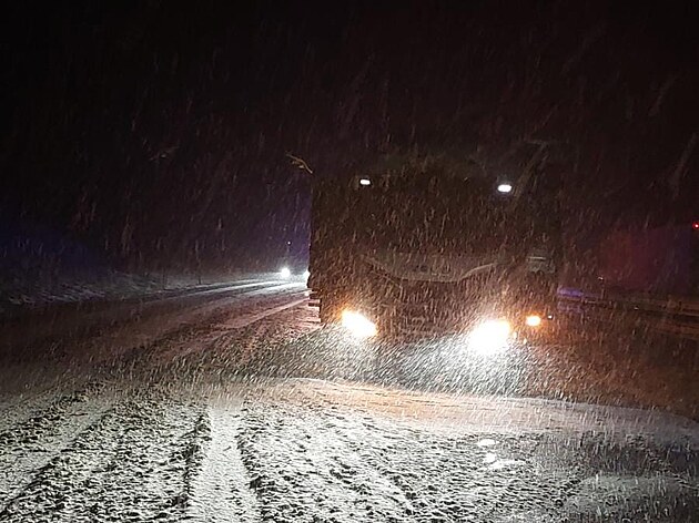 Kvůli hustému sněžení a uvázlým kamionům musela být v noci na úterý uzavřena dálnice D1 na Vysočině. (17. února 2026)