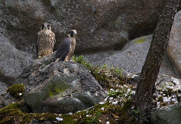 Mladí sokolové, samec se samičkou, na oblíbeném trhaništi.
