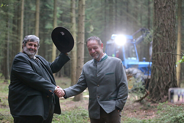 Ředitel Správy městských lesů Jihlava Václav Kodet (vlevo) po třiceti letech v jejich vedení odchází do důchodu. V lese západně od Stonařova symbolicky předal funkci svému nástupci Petru Ontolčíkovi. (24. září 2025)