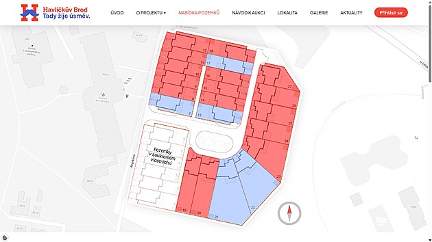 Takto byly pozemky Na Nebi rozebrané ve středu dopoledne. U červených už byla aukce uzavřena, na modré bylo možné ještě přihodit. U největších pozemků číslo 21 a 22 tak do té doby neučinil nikdo. Za to o zdánlivě obyčejnou parcelu číslo 14 se strhl boj, který vyšponoval cenu až k osmi tisícům korun za metr.