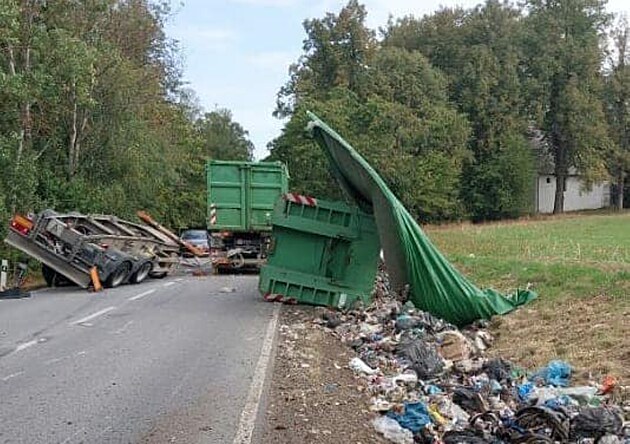 Při dopravní nehodě u obce Studnice na Třebíčsku se nákladní soupravě rozhoupal vlek, který se převrátil na projíždějící osobní vůz. Náklad se vysypal mimo vozovku. (10. září 2025)