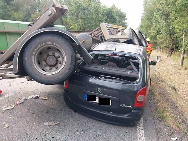 Při dopravní nehodě u obce Studnice na Třebíčsku se nákladní soupravě rozhoupal vlek, který se převrátil na projíždějící osobní vůz. Náklad se vysypal mimo vozovku. (10. září 2025)