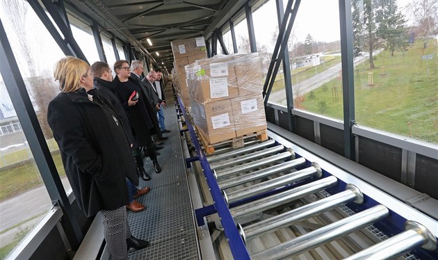 Po dopravníkovém pásu uvnitř 110 metrů dlouhého mostu přes krajskou silnici projedou denně zhruba čtyři stovky palet skla.