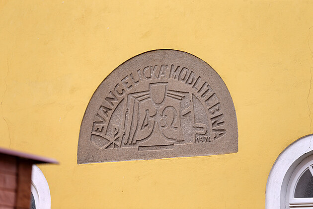Průčelí jednoduché budovy doplňuje na západní straně původní židovská hvězda a na východní evangelický reliéf z roku 1974, kdy byla stavba rekonstruována.