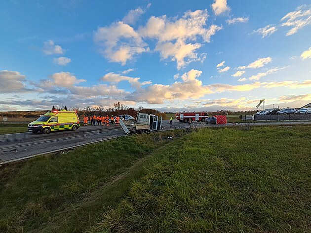 Tragická nehoda tří osobních aut u Lukavce na Pelhřimovsku si v pondělí odpoledne vyžádala jeden lidský život a tři zraněné. Na místě zasahovali záchranáři, hasiči i dva vrtulníky letecké záchranné služby (3. listopadu 2025)