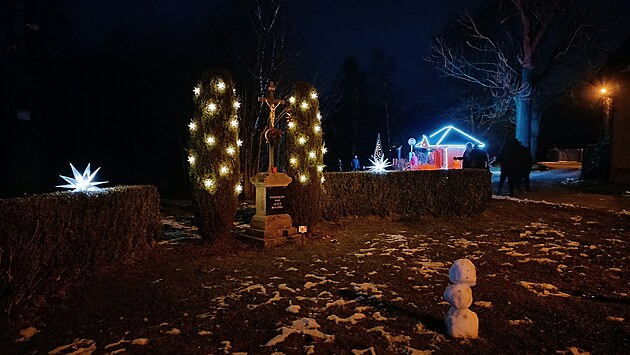Vánoční ozdoby autoři nainstalovali na nejrůznější místa. Hvězdy září i okolo křížku, nasvícená je i autobusová zastávka.