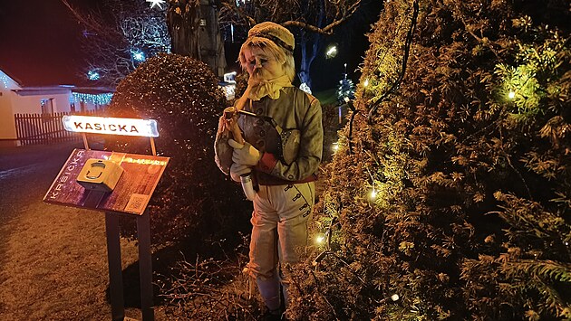 Návštěvníci Kladrub mohou přispět dobrovolnou částkou do kasičky, kterou hlídá tento pocestný, je tu uveden i QR kód. Veškeré vybrané peníze jdou skrze městys Libice nad Doubravou zpět do vánočního osvětlení Kladrub. (5. prosince 2025)