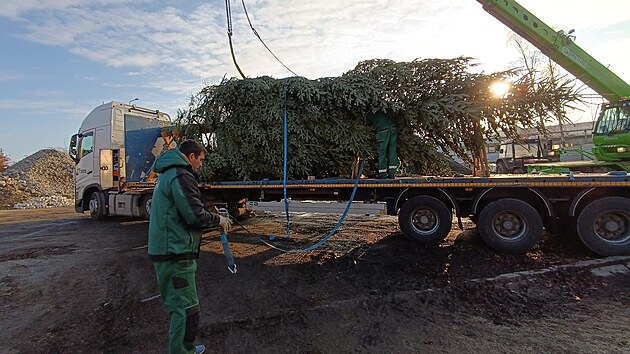 Vánoční strom naložili pracovníci havlíčkobrodských Technických služeb ve čtvrtek ráno. Po transportu dlouhém přibližně 1100 kilometrů bude jehličnan dotvářet atmosféru v partnerském holandském městečku Brielle na břehu Severního moře.