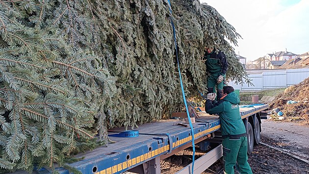 Vánoční strom naložili pracovníci havlíčkobrodských Technických služeb ve čtvrtek ráno. Po transportu dlouhém přibližně 1100 kilometrů bude jehličnan dotvářet atmosféru v partnerském holandském městečku Brielle na břehu Severního moře.