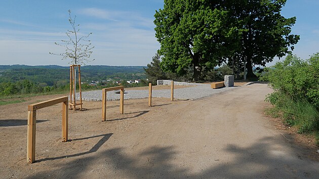 Nově vydlážděná kamenná plocha je doplněna kovovým ohništěm, posezením, stojany na kola a dalším vybavením.