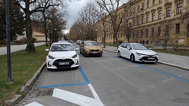 í V jednosměrné ulici Jana Masaryka před jihlavským gymnáziem a kinem Dukla už došlo ke změně způsobu parkování – svislá místa nahradila po obou stranách ulice podélná.