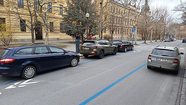 í V jednosměrné ulici Jana Masaryka před jihlavským gymnáziem a kinem Dukla už došlo ke změně způsobu parkování – svislá místa nahradila po obou stranách ulice podélná.