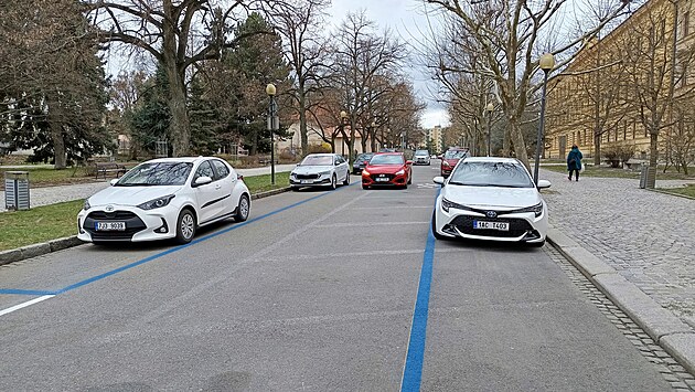 í V jednosměrné ulici Jana Masaryka před jihlavským gymnáziem a kinem Dukla už došlo ke změně způsobu parkování – svislá místa nahradila po obou stranách ulice podélná.