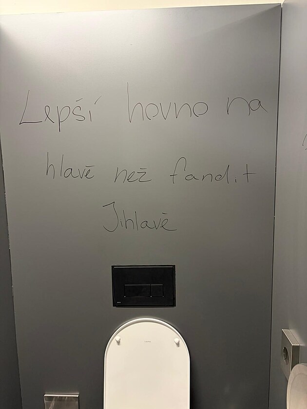 Po úterním hokejovém derby mezi prvoligovými hokejisty Dukly Jihlava a Horácké Slavie Třebíč zůstaly na záchodech Horácké arény vulgární nápisy.