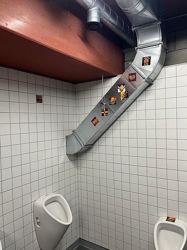 Vandalové z řad domácích fanoušků záchody v Horácké aréně vyzdobili nálepkami s tématikou Dukly.