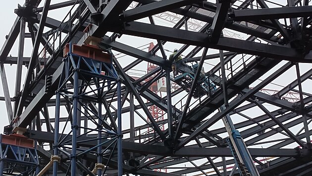 Poslední dva vazníky přidají stavebníci v lednu, celá střecha by měla být první vrstvou plechu zakryta v únoru.