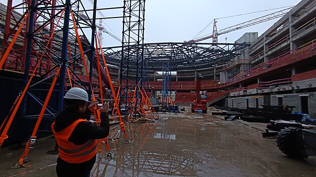 Poslední dva vazníky přidají stavebníci v lednu, celá střecha by měla být první vrstvou plechu zakryta v únoru.