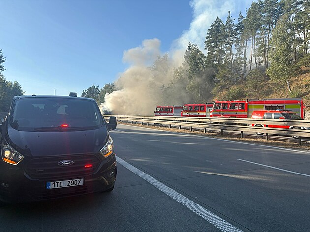 Při úterní odpolední jízdě na 80 kilometru dálnice D1 směrem na Prahu zcela shořel kamion. (26. srpna 2025)