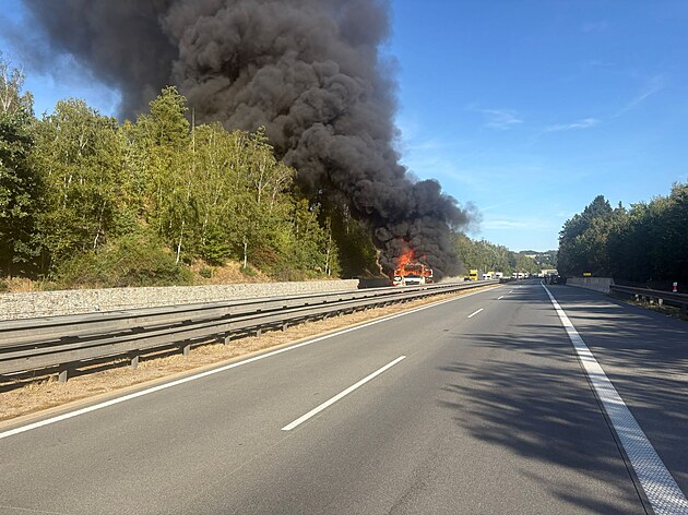 Při úterní odpolední jízdě na 80 kilometru dálnice D1 směrem na Prahu zcela shořel kamion. (26. srpna 2025)