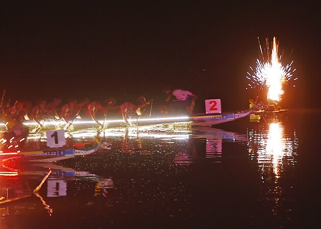 Zámecký rybník v Horní Cerekvi na Pelhřimovsku se stal dějištěm desátých nočních závodů dračích lodí. (20. září 2025)