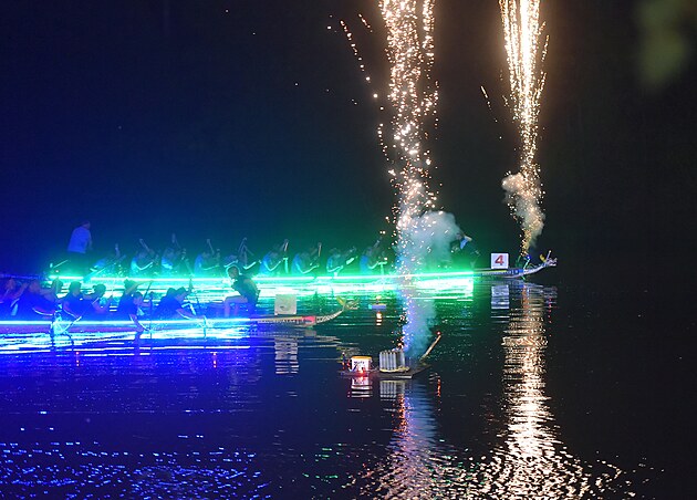 Zámecký rybník v Horní Cerekvi na Pelhřimovsku se stal dějištěm desátých nočních závodů dračích lodí. (20. září 2025)