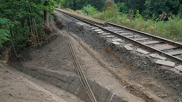 Okolí vlakové zastávky poblíž centra Velkého Meziříčí obsadila nyní těžká technika. Pracuje mimo jiné i na výměně kolejí. (15. září 2025)