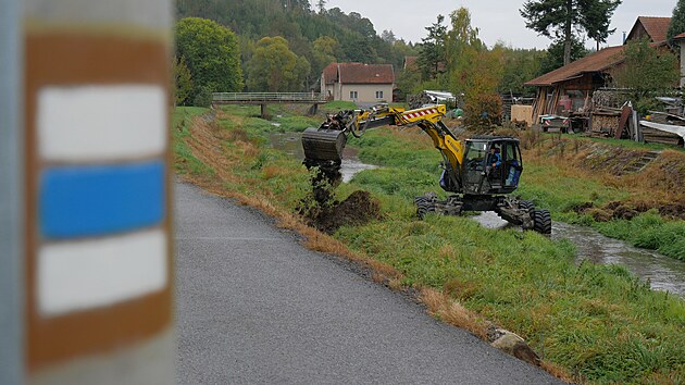 Těžká technika Povodí Moravy od počátku října v Strážku na Žďársku pracuje na údržbě vodního toku Bobrůvky.