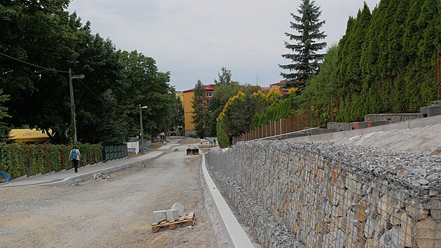 Ve spodní části Vysocké ulice už lidé s omezením využívají nové chodníky. Vznikají i terasovité stupně podél silnice. (28. srpna 2025)