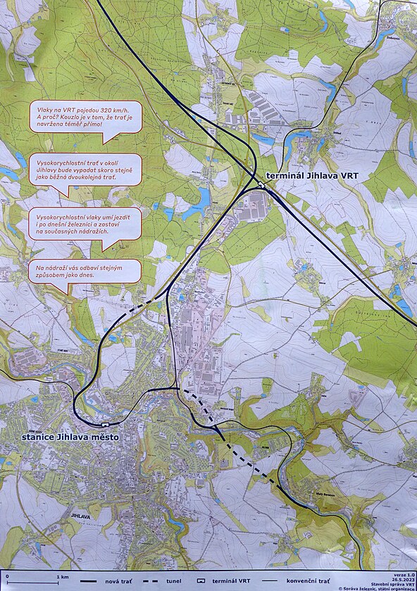 Z hlavní trati by odbočka na Jihlavu měla uhýbat u Pávova, nedaleko současného sjezdu z D1.