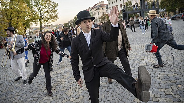Předseda uměleckého spolku Ji.na.k Lukáš Černý jde v čele prvního recesistického průvodu „švihlé chůze“, který se uskutečnil pod taktovkou spolku v pátek vpodvečer v centru Jihlavy.