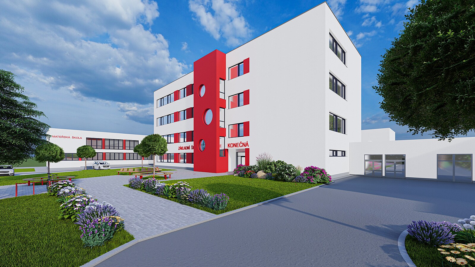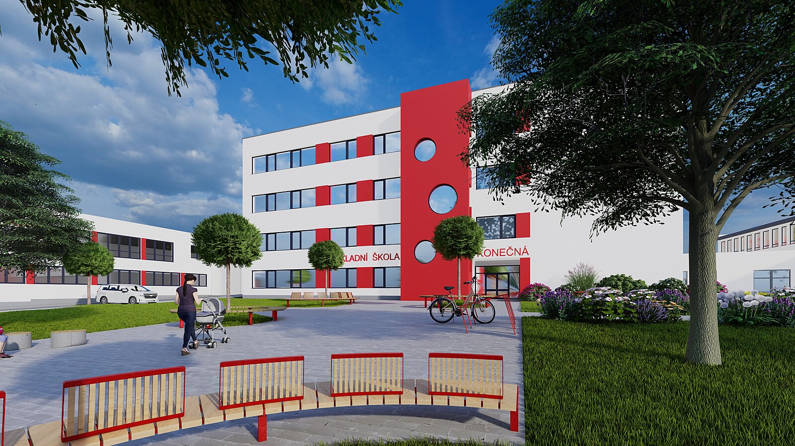 Takto by podle nejnovější vizualizace měl vypadat nový pavilon základní školy Konečná. Čtyřpodlažní budova s jedenácti třídami nahradí dávno dosloužilý provizorní dvoupatrový objekt.