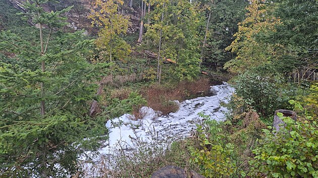 Na řece Doubravě protékající přírodní rezervací Údolí Doubravy se objevila bílá hustá pěna. O jaké znečištění jde, zatím není jasné. (7. října 2025)