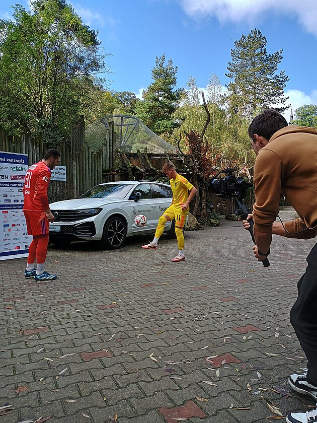 Při natáčení videoklipu FC Vysočina se v prostorách jihlavské zoologické zahrady představili brankář Adam Jágrik (v červeném) a útočník Radek Křivánek. Radost z míčů však měly i divoké šelmy: tygři a leopardi.