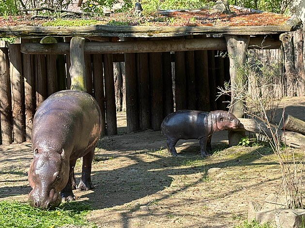 Mládě hrošíka liberijského se první dny venku v jihlavské zoo zatím drží svojí mámy.