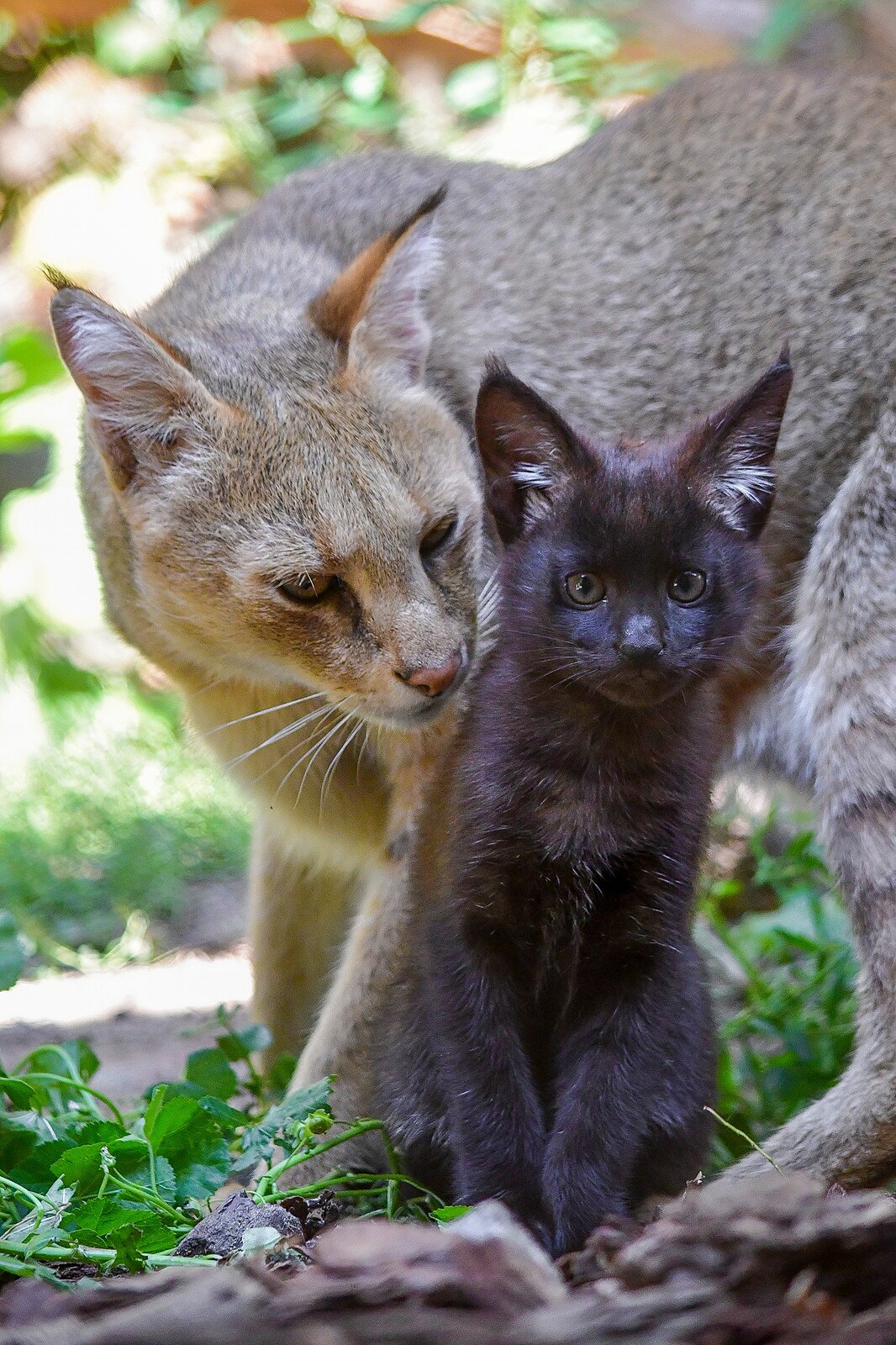 Malá kočka bažinná, jež se narodila v jihlavské zoo, se barvou srsti vůbec nepodobá své matce. Nezvyklou tmavou formu zbarvení, která vzniká na základě takzvaného melanismu, zdědila po otci.