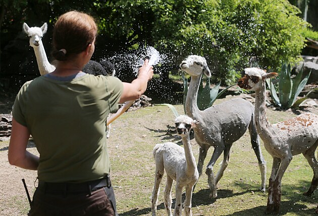 Lamy alpaky se běžně chladí tak, že si odhrabou svrchní část země a lehnou si na ni. Proto jim chovatelé kropí i zemi ve výběhu.