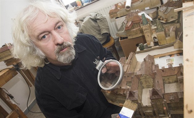 „Tohle byla prošlápnutá placka špinavá od bláta,“ ukazuje akademický malíř Jiří Grossmann na jeden z rozměrných dílů slavného papírového modelu staré Prahy. Teď se na něm tyčí domy i s vikýři a komíny, okna jsou detailně vyvedená tuší.