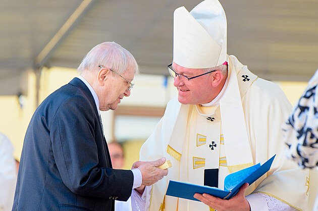 Národní pouť, Dny lidí dobré vůle, Slavnostní poutní mše svatá, Velehrad 2025. Během dvou dní dorazilo asi 30 tisíc lidí. Jiří Suchý dostal z rukou arcibiskupa Josefa Nuzíka řád svatých Cyrila a Metoděje. (5. červenec 2025)