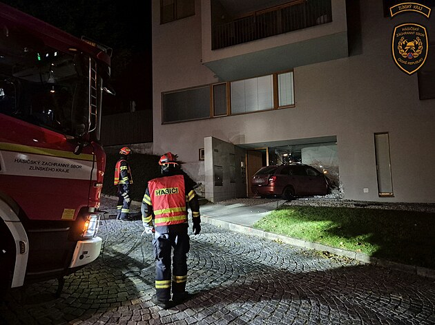 Ve zlínské ulici Partyzánská vjel automobil skrz skleněnou stěnu až do přízemí domu. (3. října 2025)