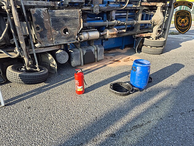 Na kruhovém objezdu ve Zlíně-Malenovicích se převrátil nákladní vůz naložený pytli s cementem. (3. října 2025)