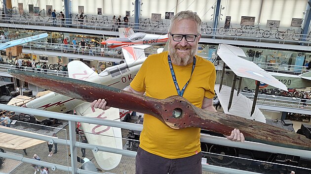 Kurátor leteckých sbírek Národního technického muzea v Praze Michal Plavec s údajnou vrtulí z Baťova letadla. Za ním letadlo Zlín Z-XIII vyrobené firmou Baťa. (červenec 2025)