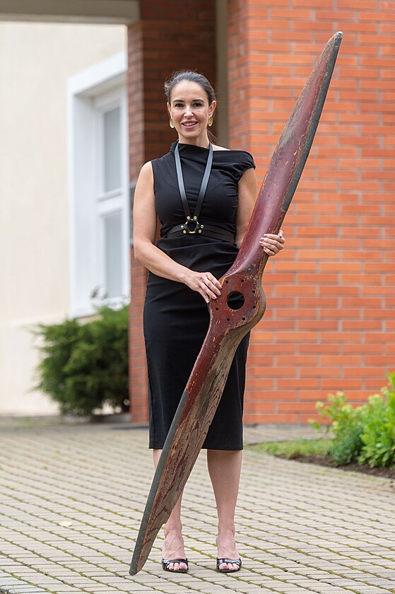 Ředitelka Nadace Tomáše Bati Gabriela Končitíková s údajnou vrtulí z letadla Junkres F.13, ve kterém zahynul v roce 1932 továrník Tomáš Baťa a pilot Jindřich Brouček. Vrtule je však novější, byla vyrobena po 2. světové válce v Otrokovicích.